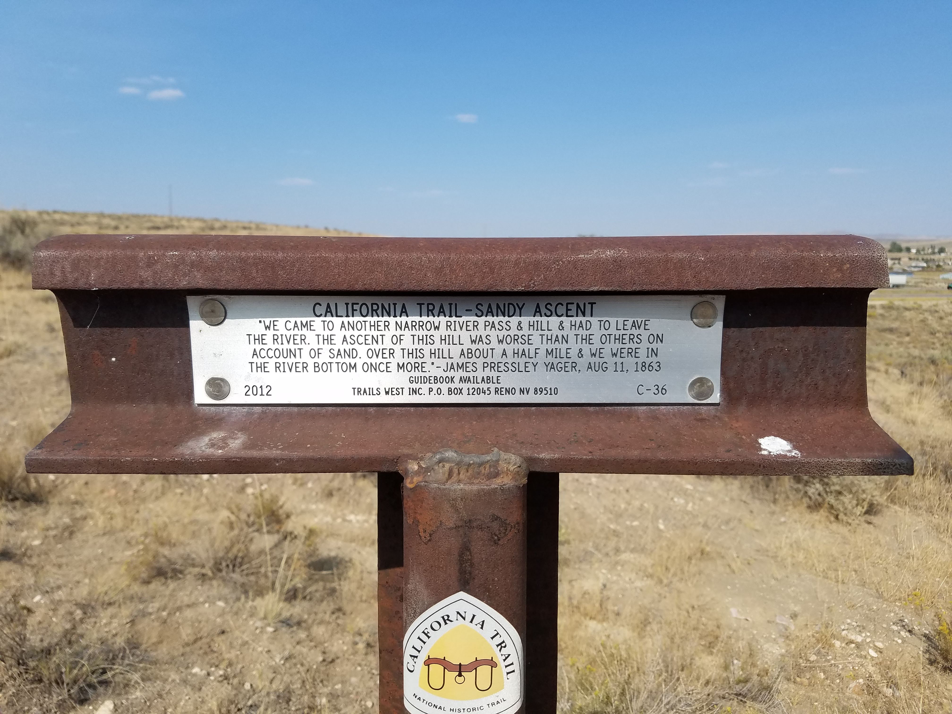 A typical T-rail marker, the one on which the video is based, is shown below. They usually have a quote engraved on a brass plate that is from one of the emigrant diaries regarding some feature or event associated with that particular spot along the California Trail.