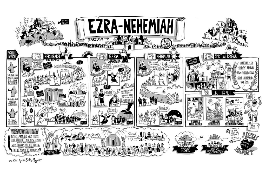 For this week’s study I’m going to turn again to the Bible Project for help. This week’s 3:16 verse is from Nehemiah and the book follows directly after Ezra. Ezra does have a chapter 3, but it only goes through verse 13, and Ezra and Nehemiah were originally composed as a single unified book, so it makes sense to consider both of them together.