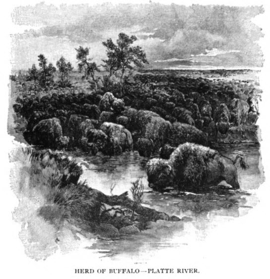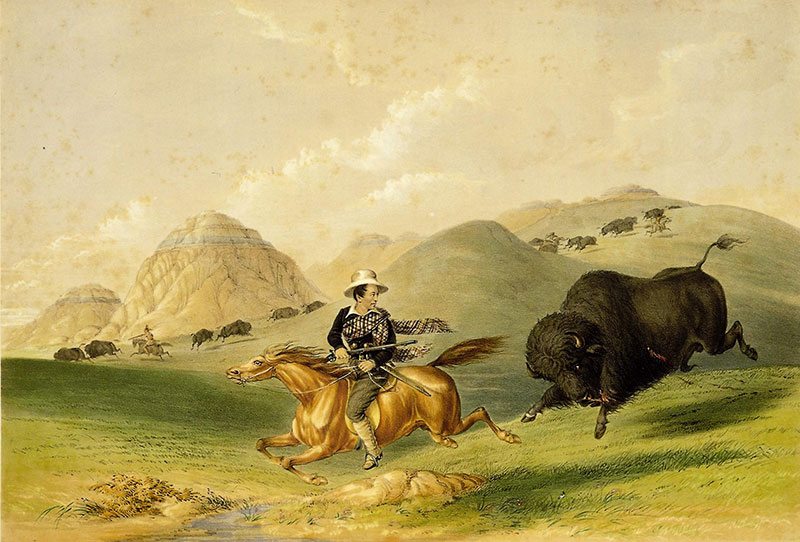 “We elected to lay by to rest our animals, have some of our wagons repaired, wash and etc. Today we again discovered a herd of 13 buffalo feeding among the sand hills, near a mile off. As soon as this was made known in camp, most all of the boys (as eager as young hounds for the chase at the blowing of the horn) shouldered their rifles and set forth to encounter the huge and unweildy animals, each eager to make a buffalo his prey, thus account himself gallantly over his companions. So thus equipped and prepared, the buffalo soon hove into sight, and as might be expected (without a commander), they made a fruitless charge, fired several guns, to no effect. The buffalo soon scampered off, at a proper and practicable distance for their comfort and safety from the young and enthusiastic hunters. To those young gents, ever afterward, acknowledged the universal adage “that experience keeps a dear school and folks will learn in no other,” and that “experience is the best of knowledge”, and “a wise man will hear counsel”, though he may think that it comes from his inferior, were every man equally self-important, those men cannot get along in peace and harmony together. No, where all the stone of a house lean apart, this house cannot stand long if the storms of adversity blow against it. Thus, our Savior admonishes us. A house divided against itself cannot stand. Man was created a dependent and helpless creature, a worshipper not to be worshipped. Consequently, the heathen bow down to sticks and stones as their superior. The christian worship their God and none other. Though we are all born with certain inalienable rights and among these are life, liberty etc., yet we must all have a leader or commander when we wish to accomplish any end conjointly and together, for as the “Father of his Country” said in his farewell address to his countrymen United we stand, divided we fall”. Union is strength, division is weakness”. Thus, you may discover that it is highly necessary to have very strict discipline in compact organized bodies of men, where there is any danger or much to accomplish.” – William Riley Franklin. Franklin’s journal can be viewed and downloaded here. The 1844 painting by George Catlin was downloaded here.