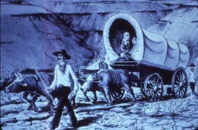 “When the camp-master designates the ground on which we are to encamp at night, the wagons are arranged in the form of a hollow-square, the tents being pitched in spaces between the wagons. The horses are then turned loose to graze until dark, when they are taken up and fastened, either to the wagons or to stakes driven into the ground, near the center of the encampment. Numerous fires are then built, with such fuel as can be obtained, with which to cook. Candles are lighted in the tents; small bands of music begin to play; songs are sung in various quarters; stories are told, and all try to entertain themselves in the best way they can.” – Franklin Langworthy. Franklin’s diary can be viewed here. The 1853 painting “Advice on the Prairie” by William Tylee Ranney is displayed on a panel in the Great Plains room of the California Trail Interpretive Center. The original is held at the Buffalo Bill Center of the West and was downloaded here.