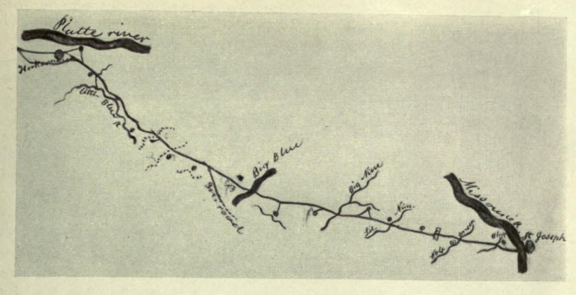 “Beautiful morning the Dr. said I could ride his horse if I liked, & having my saddle yet, I gladly excepted it; for it is tiresome riding in the waggon all the while, & every waggon should be provided, with at least one good horse, for the company to ride when they are weary, or when they wish to go out & hunt; for it is very hard to go off from the road a hunting, & perhaps kill some game, & then have it to carry & overtake the teams; for as slow a[s] an ox teem may seem to move, they are very hard to catch up with, when you fall behind an hour or two. and you need a horse also, to ride through & drive the team in all bad places, & to get up your cattle without getting your feet wet, by wading in water or dew; if such exposures as these were avoided, I do not think there would be as much sickness as there usually is, along here, for we have not passed less than 100 fresh graves from St. Joseph to the Blue river. See some dead stalk, the wolves have a feast, hope they will not disturb the graves.” – Lodisa Frizzell. Lodisa’s diary can be viewed here. The map is one of many illustrations Lodisa drew and that are found in her journal.