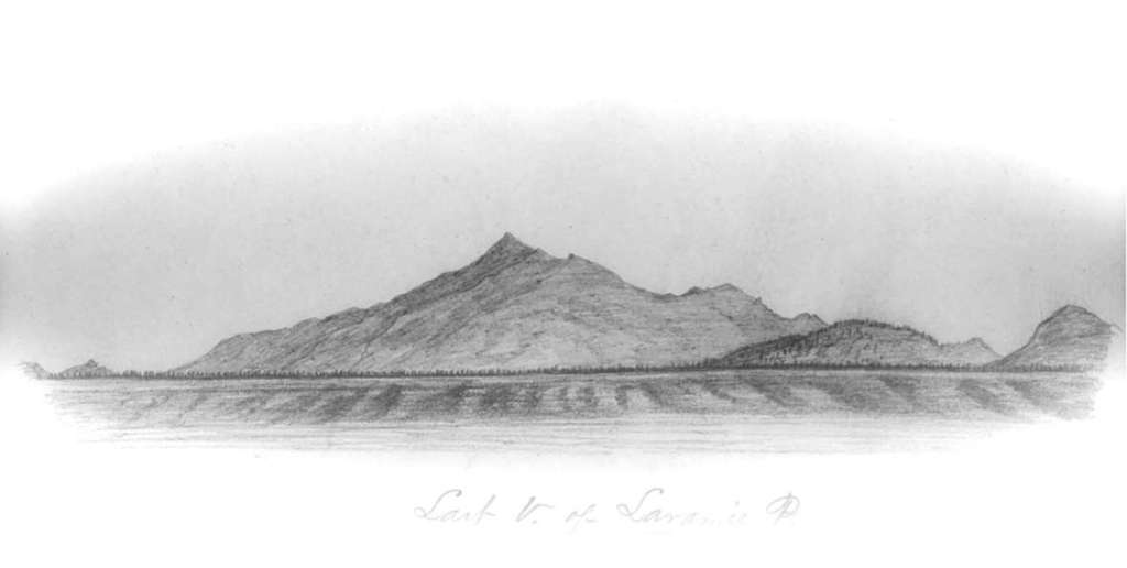 “Started at 7. Drove through the mountains 14 miles and noond at Horse Shoe Creek, Drove 8 miles further to one of the dells of the Plat and campd late in the evening. This day we were convinced that it was snow we saw on Larimie Peak.” – Alexander Love. Alexander’s diary can be downloaded from the OCTA website at https://www.octa-journals.org/merrill-mattes-collection/the-overland-journal-of-alexander-love. The sketch of Laramie Peak is from a sketchbook of William Minor “Cush” Quesenbury during his 1849 gold rush trip to California. The image was downloaded from https://www.wyohistory.org/encyclopedia/laramie-peak-landmark-oregon-trail.
