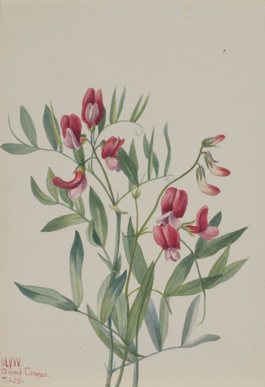 “Left the Fort [Laramie] this morning and soon began to wind among the Black Hills. Two of our men stopped at the Fort, (Simpson and Mast), but two other men, with an Indian and his family, joined us to travel to Green River. Encamped, having made about seventeen miles. Hills here sandy, many wild pears, likewise an abundance of peas (wild, though the bush was dissimilar to ours, yet the pods bore an exact similarity, taste the same).” – John Bidwell. Bidwell’s diary is included as part of the Addresses, Reminiscences, etc. of John Bidwell in the Library of Congress. You can download it at https://www.loc.gov/item/10005282/. The watercolor of the Wild Pea was painted by Mary Vaux Walcott in 1938 and was downloaded from https://americanart.si.edu/artwork/wild-pea-lathyrus-decaphyllus-26572.
