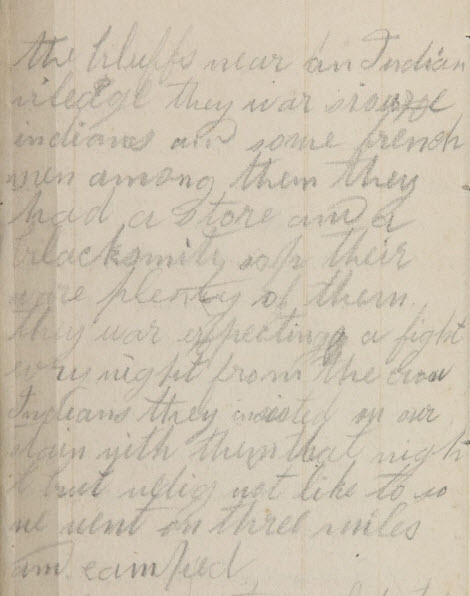 “we nooned near scots bluffs and traveled eighteen miles and then crost the bluffs we crost the bluffs near an Indian viledge they war siouse indians and some french men among them they had a store and a blacksmith sop their ware plenty of them they war expecting a fight every night from the crow Indians they insisted on our stain with them that night but we did not like to so we went on three miles and camped.” – Sarah Green Davis. Sarah’s handwritten diary can be viewed at https://collections.library.yale.edu/catalog/10001144. This entry is found on pages 20 and 21 and are partially shown in the picture.