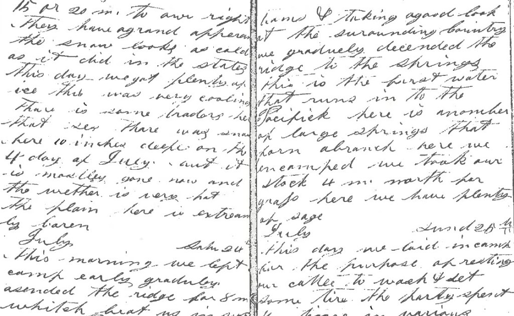 “About 18 miles today. 10 mi. brat us to the N. fork of S.W. [Sweetwater] here is a trading post good water 5 m further brat us to willow creek good water no grass 3 mi brat us to the main S. water here we encamped good water sage for fuel grass is shalo the Wind R. Mountains is about 15 or 20 mi to our right they have a grand apperance the snow looks as cold as it did in the states this day we got plenty of ice this was very cooling there is some traders here that say there was snow here 10 inches deep on the 4 day of July and it is mostly gone now and the wether is very hot the plain here is extremely baren” – John N. Lewis. Lewis’ diary is part of the OCTA collection and can be downloaded at https://www.octa-journals.org/merrill-mattes-collection/the-diary-of-john-n-lewis.