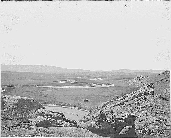 “After delaying until noon to shoe some cattle, we traveled about twelve miles to Echo Canyon, which we reached through the prettiest little valley that one could desire to see. The point at which we are now encamped is one of singular beauty, being a deep angle, or rather two of them cutting each other at right angles, and enclosed by fresh green hills, which look like they had just left the mint, or as if they had just heard the fiat ‘All is good’. Here we find the finest wild currants, which make us an excellent pie. We were overtaken by three Mormons traveling in a wagon from Fort Bridger to Salt Lake City. A very unlikely looking set of scoundrels, one of them a Mexican mongrel named George, who said he did not believe Mormon doctrine, but like Morman ways.” – Thomas Cramer. Cramer’s diary is part of the OCTA collection and can be downloaded at https://www.octa-journals.org/merrill-mattes-collection/journal-containing-incidents-of-travel-across-the-plains-from-kansas-to-california-thomas-cramer-1859. The painting by William Henry Jackson was downloaded from https://ntir.oncell.com/en/8-a-1-echo-canyon-entrance-information-68169.html.