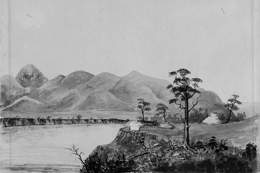 “Left camp at ½ passed 6 oclock the country through which we have travieled to day has been quite rolling however no difficult hills to clime and a few places that required us to lock down our road lay to day from 2 to 3 Miles from the [Bear] river no water except in one place whare there is a spring south of the road at which we watered our cattle. 5 Miles from our morning camp. The road striks the river at the Soda and Steamboat Springs at which place our curiosity was highly gratified these springs are situated about 200 Miles from the South pass and about 50 Miles from fort Hall and within 20 rods of Bear river on its North side They are in a beautiful grove of cedar, and surrounded by rich valleys and plains, high rolling hills, and volcanic vales, and mountains. There waters are perfectly clere and very delicious to the taste when dipping the watter from the springs the effervescence is still going on in your cup untill you place it to your lips when if you can withstand its suffocating fumes you have a most delicious draught In the vicinity of these springs there are several other soda springs which however are much less important then those I have just discribed Nere them are several conical elevations about 5 or 6 feet in heigth in the top of which is an aperture of 6 inches in diameter from which the water gushes out. these look more like the work of art than that of Nature but they are realy natureal About 100 rods below is the Steemboat Spring as it is called which discharges water and gas in the same manner but in much greater quantities and with a report quite similar to that produced by the emition of steam from the escape pipe of a steamboat hence the name Steam boat Spring It is located on the river bank and flows from the top of a rock about 4 feet above the surface of the river The top of the rock is in form of a tunnel some 3 feet across the top forming a holle in the center 8 inch in diameter the water spouting at intervals 3 or 4 feet above its surface the water is warm and highly impregnated with soda we camped to night one Mile from Steamboat spring Travieled to day 14 Miles” – Elisha B. Lewis. Elisha’s diary is part of the OCTA collection and can be downloaded at https://www.octa-journals.org/merrill-mattes-collection/diary-of-overland-trip-to-california-elisha-b-lewis-1849. The sketch of Steamboat Springs on Bear River is by James F. Wilkins in 1849 from his book An Artist on the Overland Trail and was downloaded at https://ruftydogblog.wordpress.com/2017/10/11/the-journey-5-does-your-panorama-include-an-elephant/