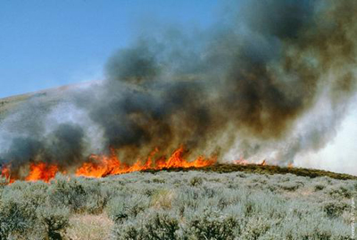 “Travelled twelve miles, crossing a deep creek; a handsome and rapid little stream, and encamped early by a smaller stream affording good water and plenty of pasture along its banks. The wild sage again becomes very plenty here, and furnishes abundance of fuel. This artemesia or wild sage, with all vegetation except along the water courses, has become dried up for the want of rain, and great care is necessary to prevent camp fires from breaking out and running over the whole country. Extensive districts are burnt over, along the road already; and it is feared by some that the little pasture remaining from the drouth, may be so destroyed with the burning of the grass, that it will be difficult to find forage enough for the teams on the road, involving the entire route yet to be traversed.” – Samuel Rutherford Dundass. Samuel’s diary can be viewed at https://archive.org/details/journalofsamuelr00dund/page/44/mode/2up. The fire picture was downloaded from https://www.fs.fed.us/database/feis/fire_regimes/mountain_big_sagebrush/all.html.
