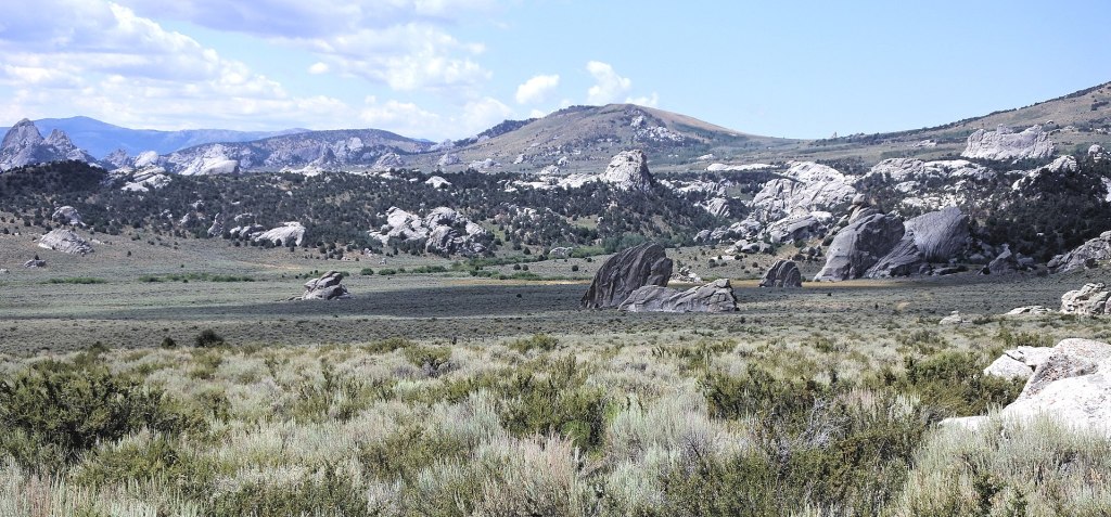 ” Morning cool. We crossed the dividing ridge separating the waters of the Pacific from Salt Lake. Five miles brought us to a creek of good water. The road here opens into a valley, eight miles wide, which is swampy in places, and contains good water; thence, the road passes around a mountain and descends into a valley, in which we camped, one mile from the mountain, in an open space [City of Rocks], near some large, rugged rocks of various forms, called Steeple Rocks. They were covered with dwarf cedars. We passed between some of these rocks, one of which is two hundred feet high. Another, jutting out thirty feet, is called Portico Rock. Here, the Mormon trail [Hensley / Salt Lake Cutoff] comes into ours. Passed over hills and came to a plain, five miles wide, which we crossed, and camped at seven. Distance, thirty miles. Passed one grave.” – Joseph Sedgley. Sedgley’s diary can be viewed at https://babel.hathitrust.org/cgi/pt?id=njp.32101074863992&view=1up&seq=50. The photo of the City of Rocks was downloaded from https://en.wikipedia.org/wiki/City_of_Rocks_National_Reserve#/media/File:City_of_Rocks_view_072617.jpg.