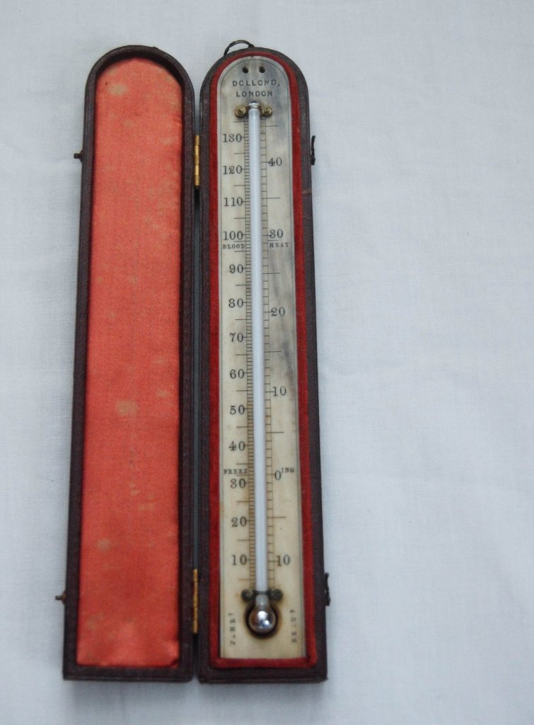 “Pleasant & calm cool again probably 38⁰. Had the misfortune to break my thermometer Decamped at 6 ½ O. Passed several fine mountain streams during the first 2 hours Our road then bore off from the mountains over a rolling hilly sage plain entirely destitute of water but containing some grass Compelled to make our M. halt without water after which some 3 or 4 m. travel brought us to a most splendid mountain stream about 3 rods wide and 2 ft. deep. Water cold and perfectly transparent After leaving this we ascended a mountain on which was grown cedar about 1 m. on the other side of which we struck on to a sage plain which was a perfect barren except the sage I judged this plain to be about 12 or 15 miles in width about 8 or 10 miles after striking this plain discovered a very fine valley containing good grass and some spring water in a dry stream Encamped in this valley about 7 ½ o’clock having driven some 24 or 25 m. Weather warm dust exceedingly bad. Sage. Fell in company with a man from the Cherokee nation who presented me with a gun holder.” – Dr. J. R. Bradway. Dr. Bradway’s journal is part of the OCTA collection and can be downloaded at https://www.octa-journals.org/merrill-mattes-collection/diary-j-r-bradway-1853. The image of a nineteenth century traveling thermometer was downloaded from https://jasonclarkeantiques.co.uk/products/nineteenth-century-leather-cased-travelling-thermometer-by-dollond-of-london.