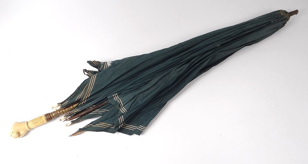 “As I was walking to-day in advance of my companions I discovered moving ahead of me a person sheltered by a huge umbrella. It was something of a novelty; I had not seen one in three months. There had hardly been a shower, except at night, during that period. All were so well tanned they cared not for shade, to preserve their complexions. Curiosity led me to quicken my steps so as to overtake and interview the strange individual. I was well repaid. I found it shadowed a dark, bilious-looking man, of large proportions, and middle age. He returned my salutation with a grunt and a growl. When l remarked that it must be pleasant for him to walk in the shade, he replied: ‘Not much; with such a heavy weight to carry.’ I asked him how he enjoyed the trip. ‘Oh, horrible,’ said he, ‘I have not had a moments peace or comfort since I started. Everything goes wrong; I’m lame, and can hardly crawl,’ and with an ‘oh ! oh!’ placed his hand upon his hip. ‘Why don’t you ride in your wagon?’ said I, ‘you could then have rest and shade.’ ‘Can’t do it,’ said he, ‘it jolts so it racks every bone in my body.’ I then suggested that he ride an easy going horse. ‘I can’t do that,’ he replied, ‘my feet swell when off the ground and pain me awfully.’ All my suggestions for his relief were met with objections, and were in vain. He didn’t even thank me for my gratuitous and kindly intended advice. He was a natural born grumbler, and grumble he would. It was undoubtedly one of his sources of enjoyment. Such unhappy, snarling fellows not only seem to make themselves miserable, but all who are compelled to associate with them. Their appropriate place is chief mourner at a funeral, or figure-head at an anxious meeting. In order to avoid as much as possible the midday heat we set out at dawn, and reached water in about ten miles, but it was poor and brackish – unfit for use. A short distance farther we found some wells or springs, of good water, and halted to let our horses feed and get our breakfast. About five miles beyond we found a fine spring of very cold water. Having made twenty-six miles we encamped. The grass was good but quite dry. The horses seemed to like it, and perhaps it was better for them than green food. We hear that the blacksmith died last night.” – Ansel J. McCall. McCall’s diary can be viewed at https://babel.hathitrust.org/cgi/pt?id=uc1.31158005904320&view=1up&seq=81. The nineteenth century umbrella photo was downloaded from https://www.antiques-delaval.com/en/various-objects-of-vertu/10754-umbrella-old-ivory-knob-sculpts-hand-roll-metal-xixeme-century.html.