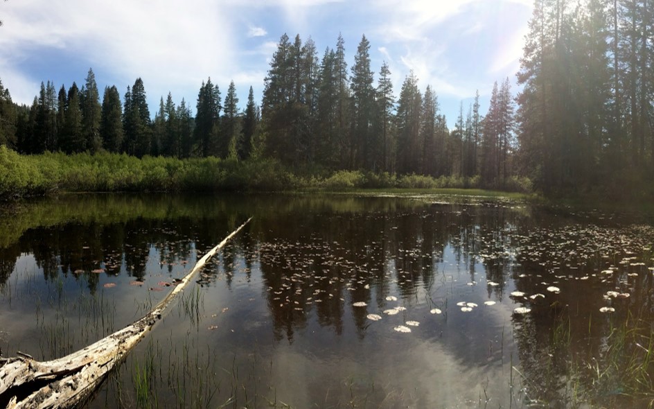 Miles from Bear river or the nearest point where the Diggens commence It being Sunday and My Horse week I concluded to travel Slow to day But the [road?] is nothing [but?] up one Hill and down another and Some all most gussipofs[?] and most of the time ove[sic] over and through Rocks Vary crocked and to look at the places they pass without seeing a road you Would think a wagon could never pass through them it must undoutdly Be one of the worst roads in the World I Have only Traveld about 12 miles to day But to add some little to Hardships we Have had a [?] fine Pine grove all day and passed a [?] number of Small Lakes of clear watter which looks Vary Lovley some Little grass but not neare enough to do the emigration that will pass this year there is no doubt but there will [be] a great deal of Disstress among the Hinemost Trains capt in a grove near a small Lake” – M. A. Violette. Violette’s diary is part of the OCTA collection and can be downloaded at https://www.octa-journals.org/merrill-mattes-collection/diary-of-m-a-violette-1849. The photo is of an unnamed pond near the South Yuba River along I-80.