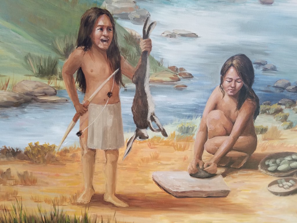 “We resolved to reach the river at the nearest possible point for, from the appearance of the country, there was reason to believe that we were in the neighborhood of the Sink; and should we travel out on the great desert, without a supply of water, the forty or fifty miles of dry sand between the Sink of the Humboldt and Truckee River would be fatal to Our teams. Therefore, turning, as we supposed, in the direction toward the Humboldt, in about four miles we came to a large slough of brackish water, the main channel of the river being about three-fourths of a mile beyond, and along the edge of an extensive marsh. Between this slough and the river the lowlands produced excellent grass. Following down the slough about three miles we stopped to allow the teams to feed and rest. We are no longer troubled with preparing dinner; our rations are dealt out so sparingly that we seldom eat anything at noon. Indeed we would like to forget the dinner hour, but the more we try, the more we can’t. Near our noonday resting place we found a large number of Pah Ute Indians gathering the seeds of a large plant which grew in great abundance around the marsh. The seeds are ground with a stone rolling pin on a broad stone having the upper surface neatly dressed into a deep curve. The meal is mixed with water and molded into cakes and baked on a bed of coals, made of dry sage roots which the squaws brought in large cone-shaped baskets. These Indians are smaller than any we had yet seen, nor are they so well formed; some are dressed in buckskin, but many have the cast-away clothing of the emigrants, and the children are nearly or quite naked. Living on vegetables, and especially on roots, they have obtained for themselves the name “Diggers.” In the afternoon we moved about three miles, still keeping near the slough and meadow, which, in its rich green, contrasted strangely with the surrounding desert; like the sweet sanctity of home in a cheerless world. Almost baffled in our efforts to obtain fuel, we at last brought the dry roots of rushes from a bog half a mile distant. They burned readily, but produced little else than smoke and ashes. However, in the absence of provisions to cook, heating our coffee was the only practical need of fire.” – John Steele. Steele’s diary can be viewed at https://babel.hathitrust.org/cgi/pt?id=uc1.31822042768408&view=1up&seq=264&skin=2021. The painting by Jeanine Hattas is from the Great Basin Room mural in the California Trail Interpretive Center.