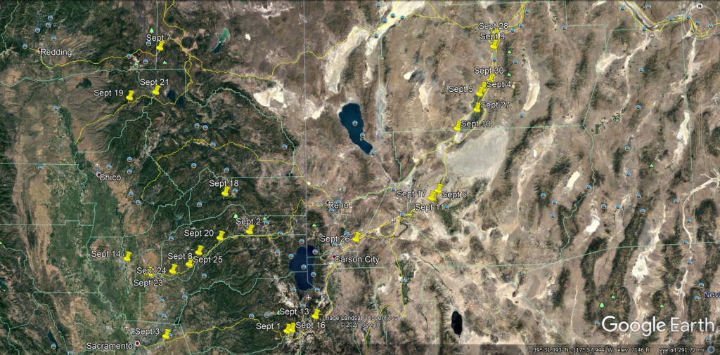 This is the final month of my daily diary excerpts from a “virtual journey” along the California Trail, posted on social media for the California Trail Interpretive Center in Elko, Nevada. During September the portion of trail covered during this hypothetical journey is shown in the Google Earth image, starting near Winnemucca, Nevada and continuing along the various possible routes to California.