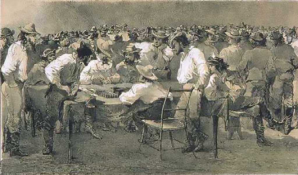 Edward Gould Buffom’s account of his adventures in gold fields of California can be downloaded from the Library of Congress at https://www.loc.gov/item/rc01000767/. He had arrived in California by ship with a regiment in 1847 during the Mexican-American war. After the sale of California by Mexico to the U.S. in 1848, and the discovery of gold that year as well, Buffom left his newspaper job in San Francisco to enter the gold fields in October, 1848. After arriving at Weaver’s Creek in Northern California on December 4, Buffom wrote “The day after our arrival, in anticipation of the immediate commencement of the rainy season (a time dreaded by strangers in all California, and particularly in the northern region), we determined to build a log house, and were about to commence operations, when we received an offer for the sale of one. We examined it, and found a little box of unhewn logs, about twenty feet long by ten wide, which was offered us at the moderate price of five hundred dollars. The terms, however, were accommodating, being ten days’ credit for the whole amount. With the reasonable expectation that we could pay for our house by gold-digging in a less time than it would require to build one, we purchased it, and ere nightfall were duly installed in the premises…. Our party’s first day’s labour produced one hundred and fifty dollars, I having been the most successful of all. But we were satisfied, although our experience had not fulfilled the golden stories we had heard previous to our reaching the placers . Finding the average amount of gold dug on Weaver’s Creek at that time to be about an ounce per day to a man, we were content so long as we could keep pace with our neighbours. There is a spirit of emulation among miners which prevents them from being ever satisfied with success whilst others around them are more successful. We continued our labours for a week, and found, at the end of that time, our whole party had dug out more than a thousand dollars; and after paying for our house, and settling between ourselves our little private expenses, we were again on a clear track, unencumbered by debt, and in the heart of a region where treasures of unknown wealth were lying hidden in the earth on which we daily trod.”