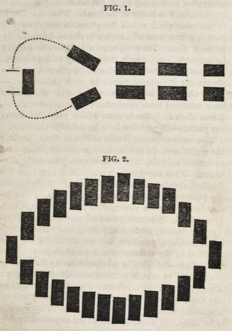 Joseph Ware’s guide (referenced in the April 1 post and viewed at https://archive.org/details/GR_4538) also included instructions for how to set up camp. He said “These directions are given on the supposition that you have organized properly, and that every member of the company is willing to submit to the orders of the Captain. Camps are usually enclosed by a ‘caral,’ or enclosure, formed by driving the wagons in an eliptical or circular form. It requires a little practice to make one at the commencement of the journey. By referring to the diagrams [see accompanying photo], Fig. 1, it will be seen that before you arrive at the spot selected for a camp, the wagon in the middle of the line strikes out to one side of the road, and is followed by all behind. By driving a little faster, the middle wagon soon gets abreast of the head of the line, thus forming two parallel lines; fifty yards from your camp ground, one of the wagons will be driven ahead, and reined up square across the road, while the wagons following, divide their lines on either side, and take their places as indicated in Fig. 2…. Cooking operations are generally carried on outside of the enclosures…. The cattle are usually turned out soon to feed, whenever you stop to camp, where they are guarded by a company of ‘herds,’ detailed every day for the purpose. After feeding, if near night, they are driven into the enclosure, there to remain until turned out next morning by the herds, for the day. Designate your herds every night. It is necessary, frequently, to stake them inside of the caral. When it is unsafe to turn your stock out on the plains to feed, you will have to secure them with ropes, to stakes, driven firmly in the ground. The camp must at all times be guarded by sentinels, every man in the company taking his turn. No shooting of fire arms should be allowed, as false alarms are frequently raised by such carelessness. Never allow guns to be capped or cocked in camp; deaths have occurred from carelessness in this particular.”