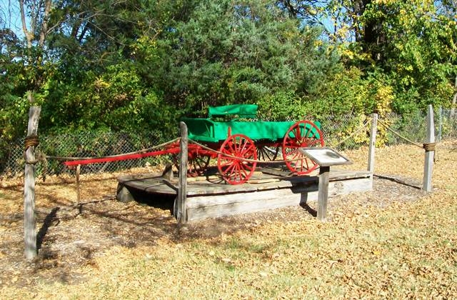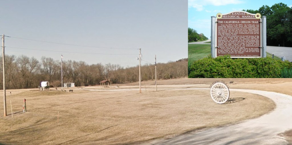 Oregon Trail Park at Scott Spring (GPS coordinates -96.406, 39.383) is located on the “Road to Oz” Highway (Highway 99) just south of Westmoreland, KS. There are a number of interpretive panels there as well as a State Historical Marker just south of the park. In addition to the interpretive panels, you can see a covered wagon replica, an emigrant grave, and walk a footpath along Rock Creek and Scott Spring. The photographs are from Google Maps Streetview.