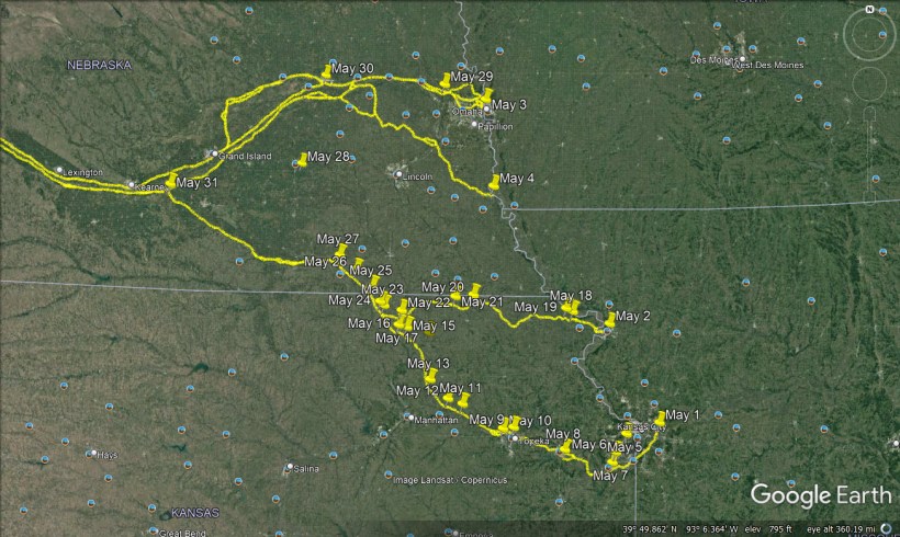 All roads along the westward Trails converged on either the north or south sides of the Platte River. We conclude the May portion of our virtual journey by visiting the grave of Susan Hail (GPS coordinates -98.724, 40.655) at the point where the Independence / St. Joseph road meets the Platte River road. The historic marker database (https://www.hmdb.org/m.asp?m=123807) has a good description of the gravesite and that is where the pictures were downloaded.
