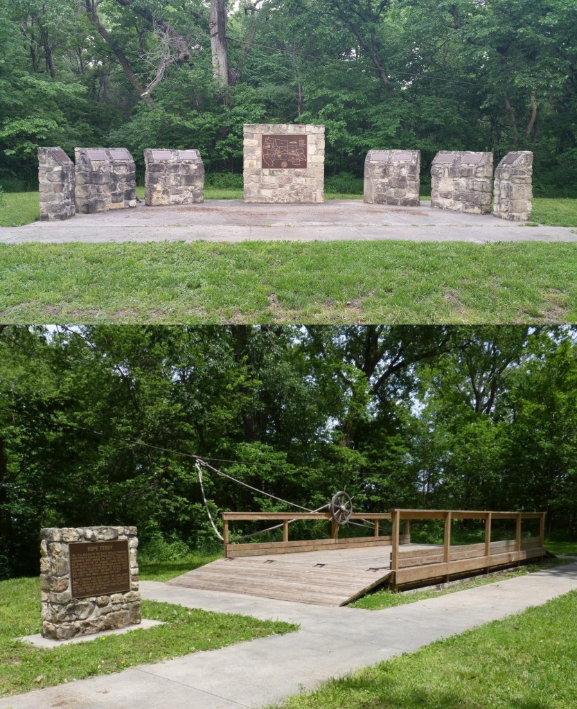 The Big Blue river crossing lies just west of Marysville, KS very near where US Highway 36 crosses it. Near here you can visit Historic Trails Park (GPS coordinates -96.659, 39.843) which has several interpretive signs and a full-size replica of a rope ferry that was used by emigrants to cross the river. The photographs were downloaded from https://www.visitmarysvilleks.org/attraction/historic-trails-park/ and from https://lh5.googleusercontent.com/p/AF1QipPSzxihRnCwm1iS1T7sLSpZQYlmKuPFkDrrcmdJ=h1440.