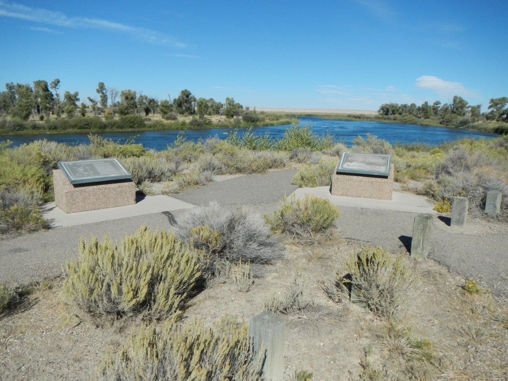 The Lombard Ferry (https://www.wyohistory.org/encyclopedia/lombard-ferry-green-river GPS coordinates -109.805, 41.880) across Green River on the Salt Lake City route and Fort Bridger route was first established by mountain men in 1843 and sold to Mormon operators in 1847. It later became known as the Lombard Ferry in 1889. The Historical Marker Database describes 7 interpretive markers at this location, including the ones in the photograph from https://www.hmdb.org/m.asp?m=88481.