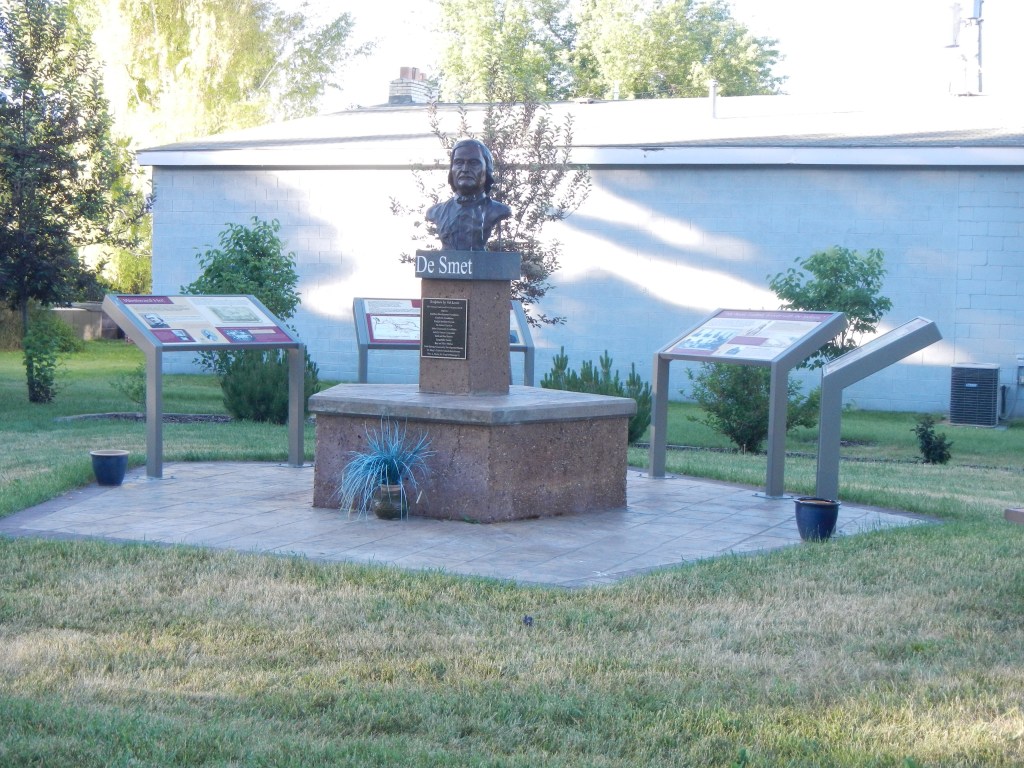 St. Mary’s Catholic Church is located just south of the cemetery described in yesterday’s post. There you will find a bust and four interpretive signs about Father Pierre De Smet (also discussed on our July 22 virtual tour post). This memorial (GPS coordinates -111.606, 42.656) is described on the Historical Marker Database at https://www.hmdb.org/m.asp?m=106775 and the accompanying photograph comes from that web page. De Smet was a part of the wagon train traveling the Oregon Trail in 1841. It was at this point that the Bidwell/Bartleson group broke off from the train and headed overland to California, becoming the first group of emigrants to make that journey.