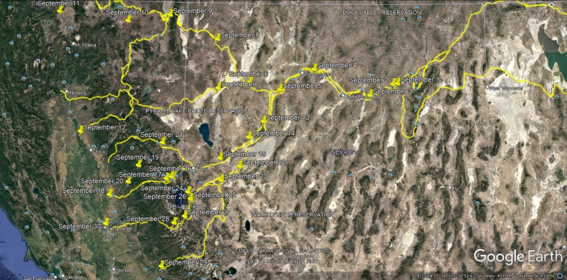 Before we reach our journey’s final destination we’ll mention one more route to California. The Historical Marker Database (https://www.hmdb.org/m.asp?m=7566) provided the photograph and description of a marker in Sonora that commemorates the ending point for the Sonora Trail (GPS coordinates -120.369, 37.975). The trail along the Walker River and over Sonora pass was only used for a few years in the early 1800s. Trails West has a driving guide available for purchase at https://emigranttrailswest.org/trail-guides-for-purchase/walker-river-sonora-trail-driving-guide/.