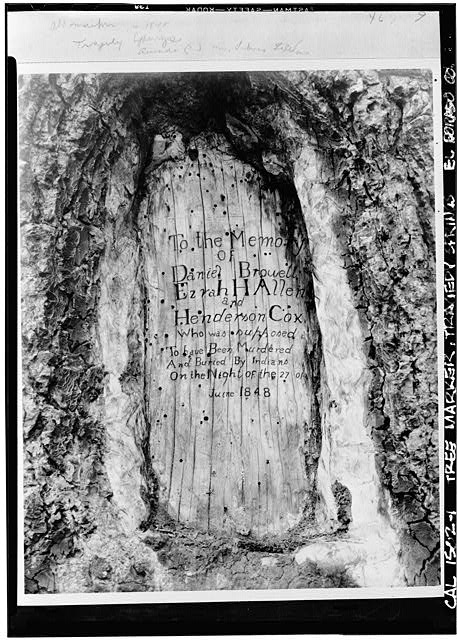 The Mormon Battalion had been in California to fight in the Mexican – American War and were returning to Salt Lake City. They were asked to find a better route across the mountains for the influx of emigrants and blazed the Carson Route in 1848. On June 27 three of their scouts were attacked and murdered by unknown people. When they were found, their bodies were buried in a common grave and their names were carved on a nearby tree. The photograph is from the Library of Congress at https://www.loc.gov/pictures/item/ca0161.photos.020555p/resource/ and a description can be found on the Historical Marker Database at https://www.hmdb.org/m.asp?m=21273 (GPS coordinates -120.147, 38.639).