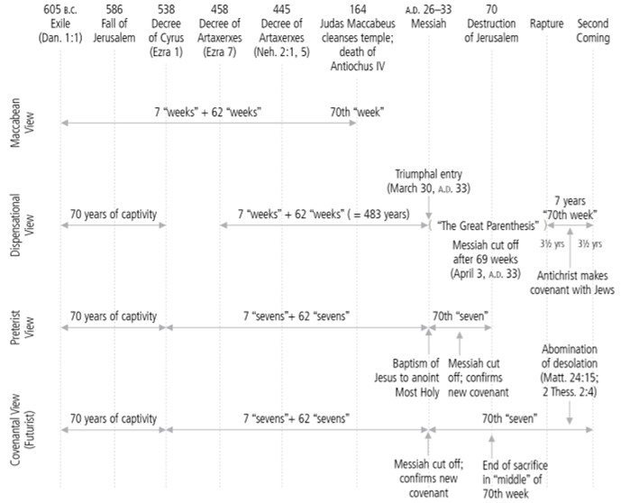 The ESV Bible Online Global Study Bible has a diagram (shown below) which illustrates various ways that people tend to interpret these 70 weeks. I personally lean toward the Dispensational View largely because that’s the way I’ve learned it over the years, but also because it seems to me to make the most sense to me as I read the scriptures.