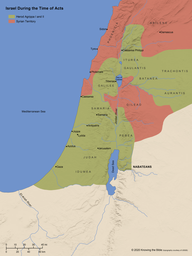 The road to Damascus from Jerusalem was about 140 miles. Traveling at an average of about 2 miles per hour for 10 to 12 hours per day, this would make it an 8 day journey, assuming they don’t travel on the sabbath. If Paul’s cohort traveled on horseback, they could have trimmed off a day or two from the journey. The reference map below is from Bible Maps and shows the regions under the control of the Herods and the Syrians during Paul’s time.