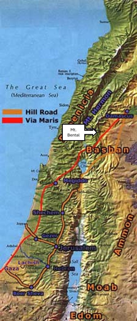 The map below is from the Jewish Virtual Library and shows the Via Maris (red) and the Hill Road (orange). Paul’s group likely took one of those routes and either one leads to Damascus. I’ve added a label to the map showing the approximate location of Mount Bental.
