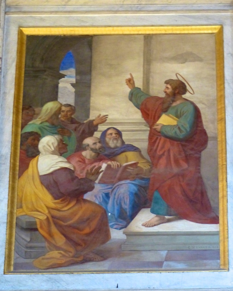 The fifth fresco painting from the Papal Basilica of Saint Paul Outside the Walls (and photographed by the Hermit’s Door) depicts Paul preaching in a synagogue in Damascus.