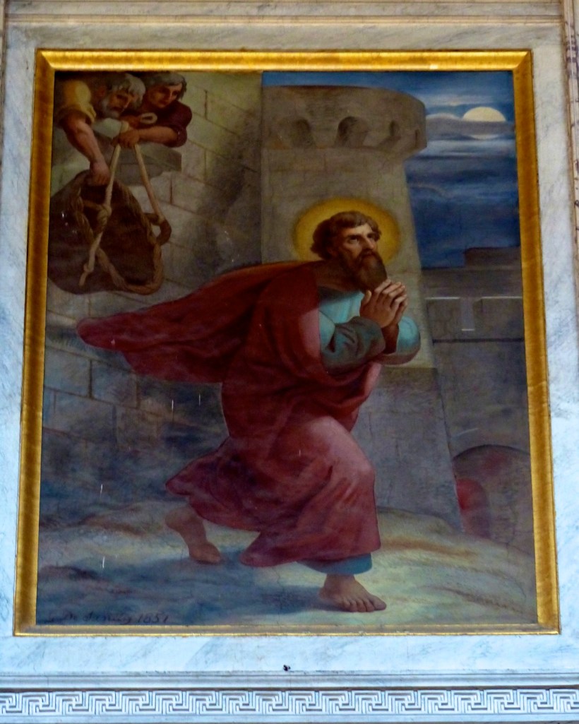 After his three years doing whatever he was doing in Arabia, Paul returned to Damascus for a final time and learned of a plot to kill him or capture him for Aretas. His disciples lowered him through a window in a basket to help him escape. The sixth fresco painting from the Papal Basilica of Saint Paul Outside the Walls depicts this event.