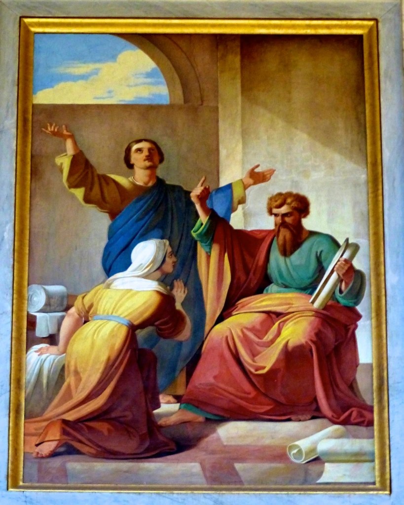 The seventeenth fresco painting from the Papal Basilica of Saint Paul Outside the Walls (and photographed by the Hermit’s Door) depicts Paul worshipping with Aquila and Priscilla.