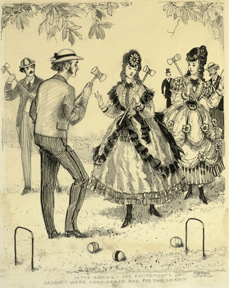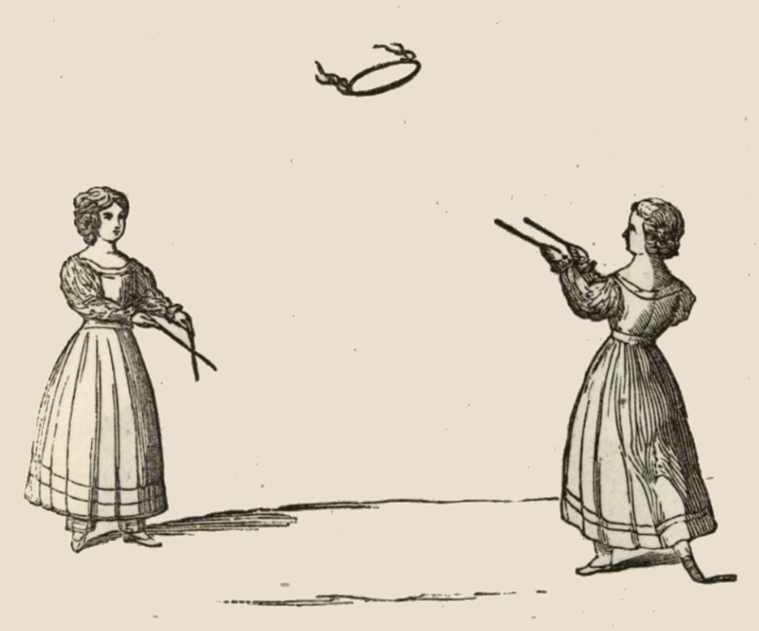 I also have some yard games next to a couple of the houses that represent how folks found outdoor entertainment at social gatherings. One game is called Graces, in which two players each use a pair of sticks to toss a hoop through the air and catch it.