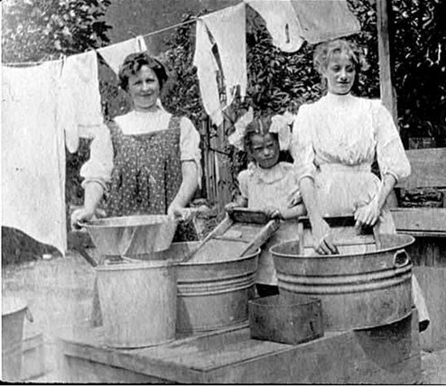 Students also enjoy doing laundry. They have a tub of water and a washboard to use. They wet the clothes, scrub them, wring them out, and then hang them over the fence to dry.