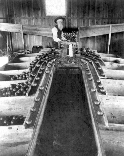 Students also explore how oranges were sorted mechanically by rolling oranges through a gravity fed antique orange sorter that allows the (plastic) oranges to sort according to size and drop into containers.