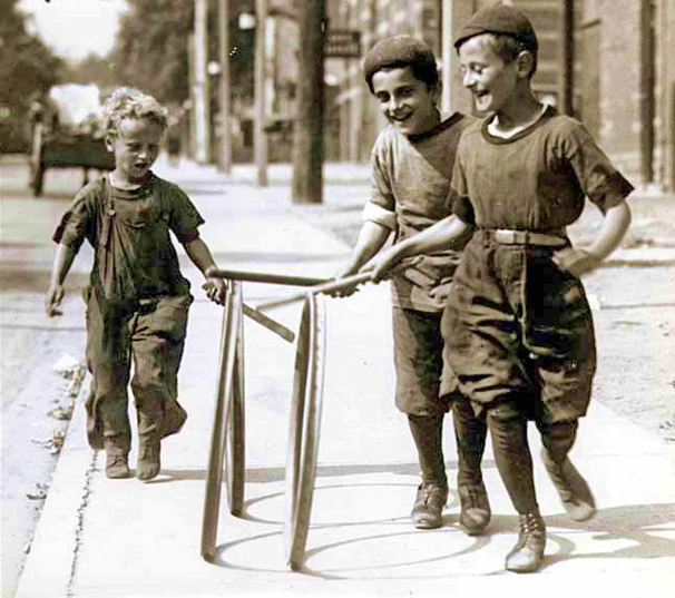 Outside the schoolhouse, students engage in two “recess” games. One is hoop rolling. Using a stick and a large wooden hoop, students try to roll the hoop along the ground without it falling over. It’s harder than it looks!