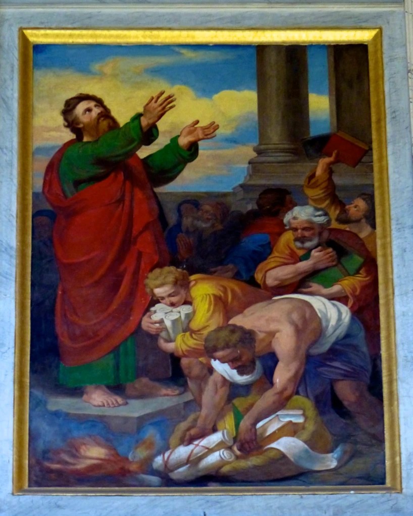 The eighteenth fresco painting from the Papal Basilica of Saint Paul Outside the Walls (and photographed by the Hermit’s Door) shows the people gathering the scrolls for burning as described above.