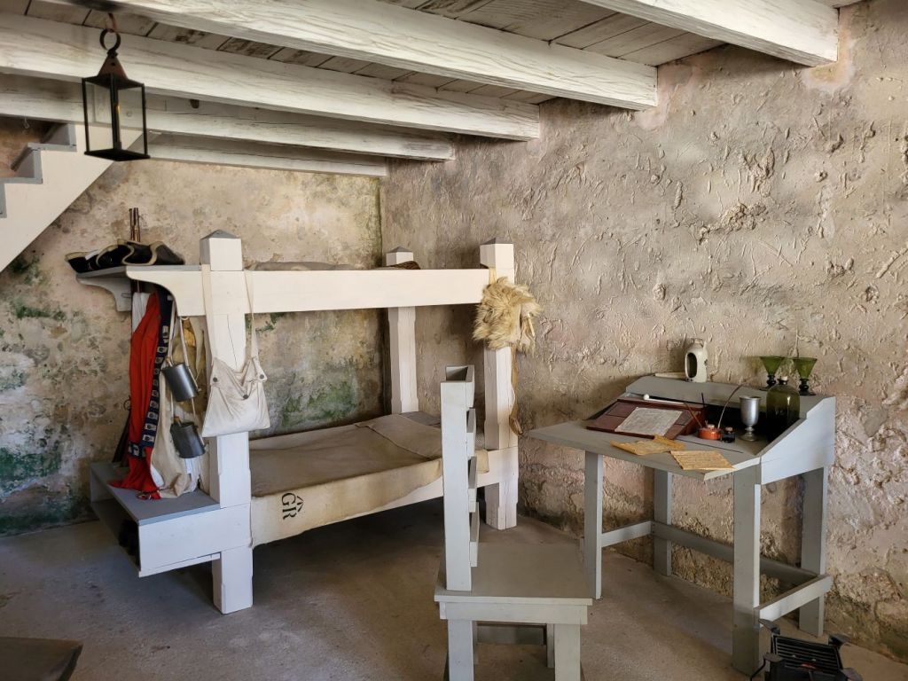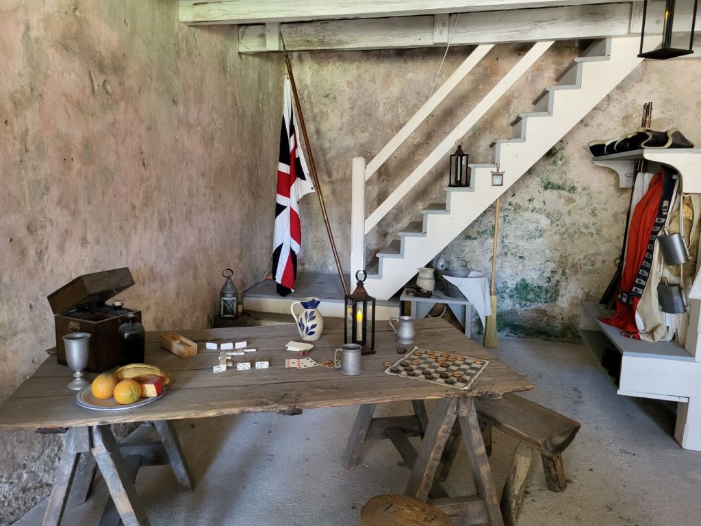 Some of the rooms are furnished and equipped to illustrate how they might have been during the various stages of the fort’s history (over the past 450 years). The 1760s-era British quarters are shown below.