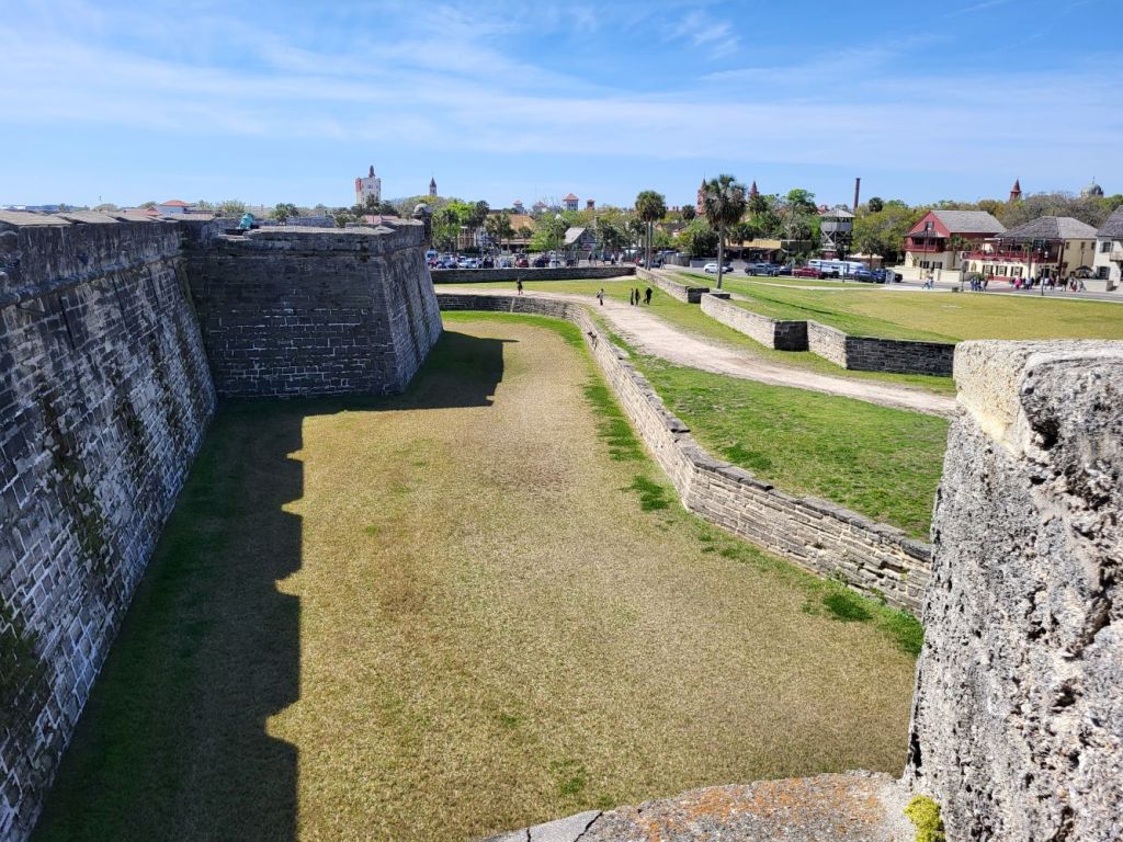 Looking over the wall from the terreplein you can see the dry moat that surrounds the fort and provides protection for soldiers as they move around the outside of the fort. It also serves as protection from attack.