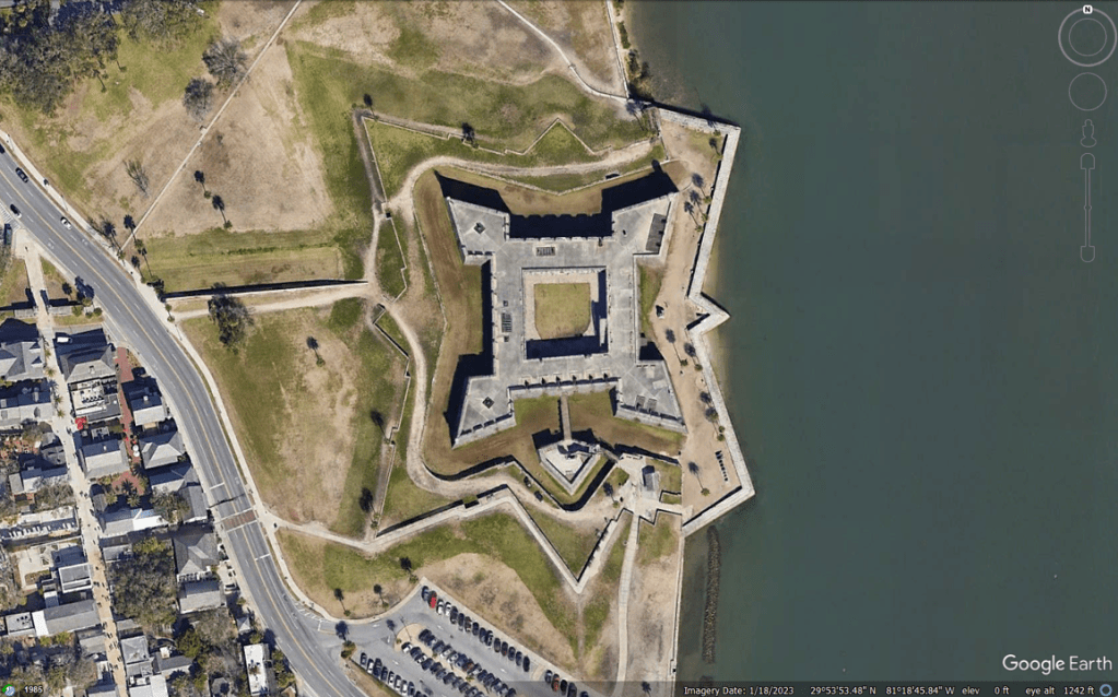 The Castillo is the oldest masonry fort in the U.S, in the oldest continuously inhabited city (of European origin) in the U.S. The fort is a classic star shape as shown in the Google Earth photo below.