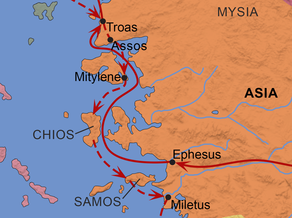 Luke indicates that Paul wanted to be in Jerusalem by Pentecost, which would be 50 days after leaving Philippi. The following map of his 3rd missionary journey shows the entire route, with the specific stops described above in the magnified image below that.